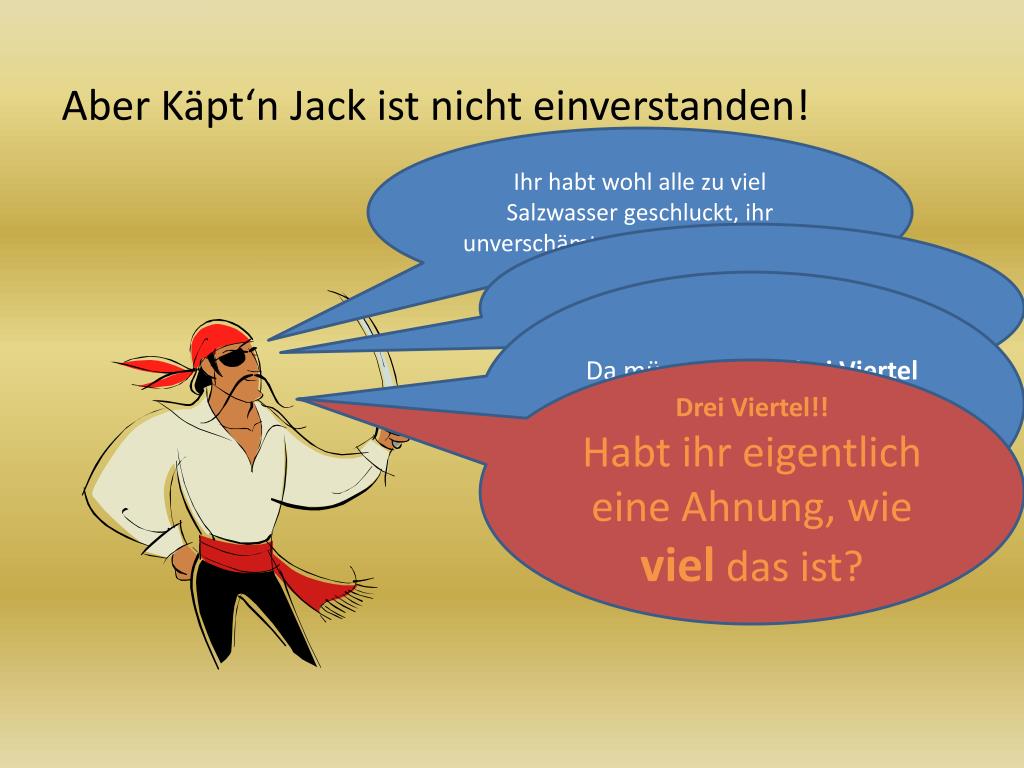 Ihr habt wohl alle zu viel Salzwasser geschluckt, ihr unverschämten Heringsschwänze! Aber Käpt‘n Jack ist nicht einverstanden! Ich bin der Käpt’n. Das ist alles meins! ! Da müsste ich ja dreiViertel von allen Vorräten abgeben! Drei Viertel! Drei Viertel!! Habt ihr eigentlich eine Ahnung, wie viel das ist?