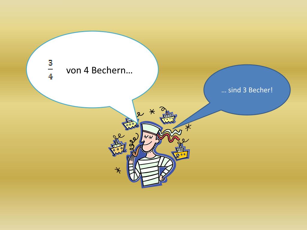 Und hier sind die Lösungen: ¾ von 12 Heringen sind 9 Heringe ¾ von 500 g Brot sind 375 g Brot ¾ von 3,60 m sind 2,70 m ¾ von 120 g Salz sind 90 g Salz ¾ von 18 Scheiben Zwieback sind 13 ½ Scheiben Zwieback ¾ von 1 Salami ist ¾ Salami ¾ von 3000 ml Rum sind 2250 ml Rum Psst! Erst durch 4 und dann mal 3! Oh! Aufschreiben vergessen? Hier geht’s zurück…