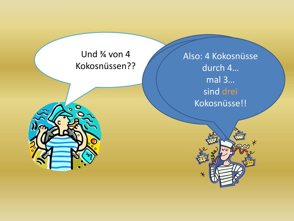 Und ¾ von 4 Kokosnüssen?? Ganz einfach, Mann! Du musst zuerst durch 4 teilen, dann hast du ein Viertel… Also: 4 Kokosnüsse durch 4… mal 3… sind drei Kokosnüsse!! … und dann mit 3 malnehmen, dann hast du drei Viertel.