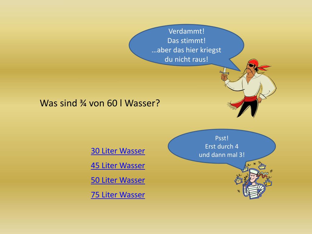 Verdammt! Das stimmt! …aber das hier kriegst du nicht raus! Was sind ¾ von 60 l Wasser? Psst! Erst durch 4 und dann mal 3! 30 Liter Wasser 45 Liter Wasser 50 Liter Wasser 75 Liter Wasser