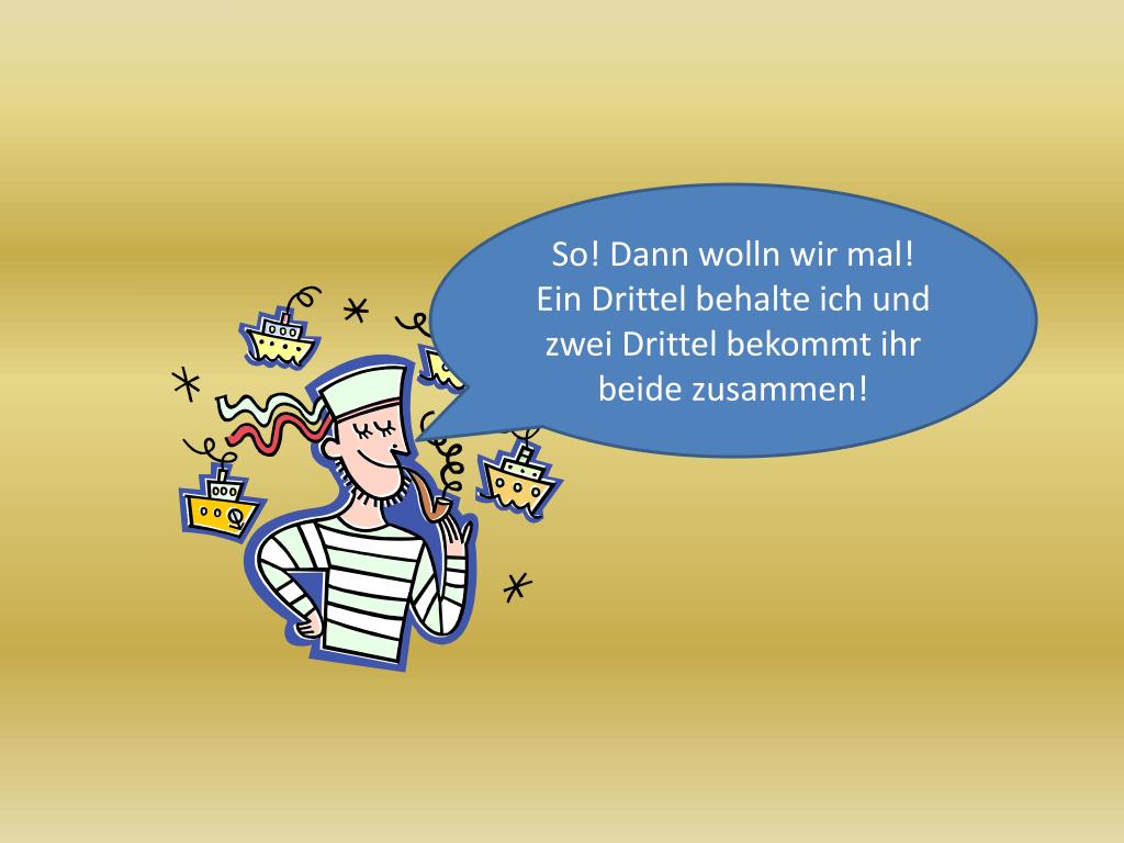 So! Dann wolln wir mal! Ein Drittel behalte ich und zwei Drittel bekommt ihr beide zusammen!