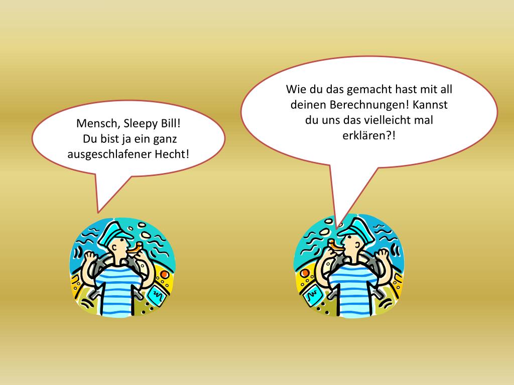 Wie du das gemacht hast mit all deinen Berechnungen! Kannst du uns das vielleicht mal erklären?! Mensch, Sleepy Bill! Du bist ja ein ganz ausgeschlafener Hecht!