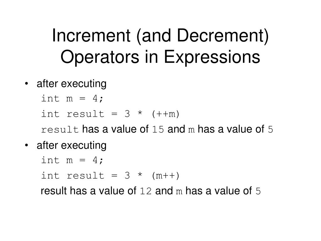 Increment (and Decrement) Operators in Expressions • after executing int m = 4; int result = 3 * (++m) result has a value of 15 and m has a value of 5 • after executing int m = 4; int result = 3 * (m++) result has a value of 12 and m has a value of 5