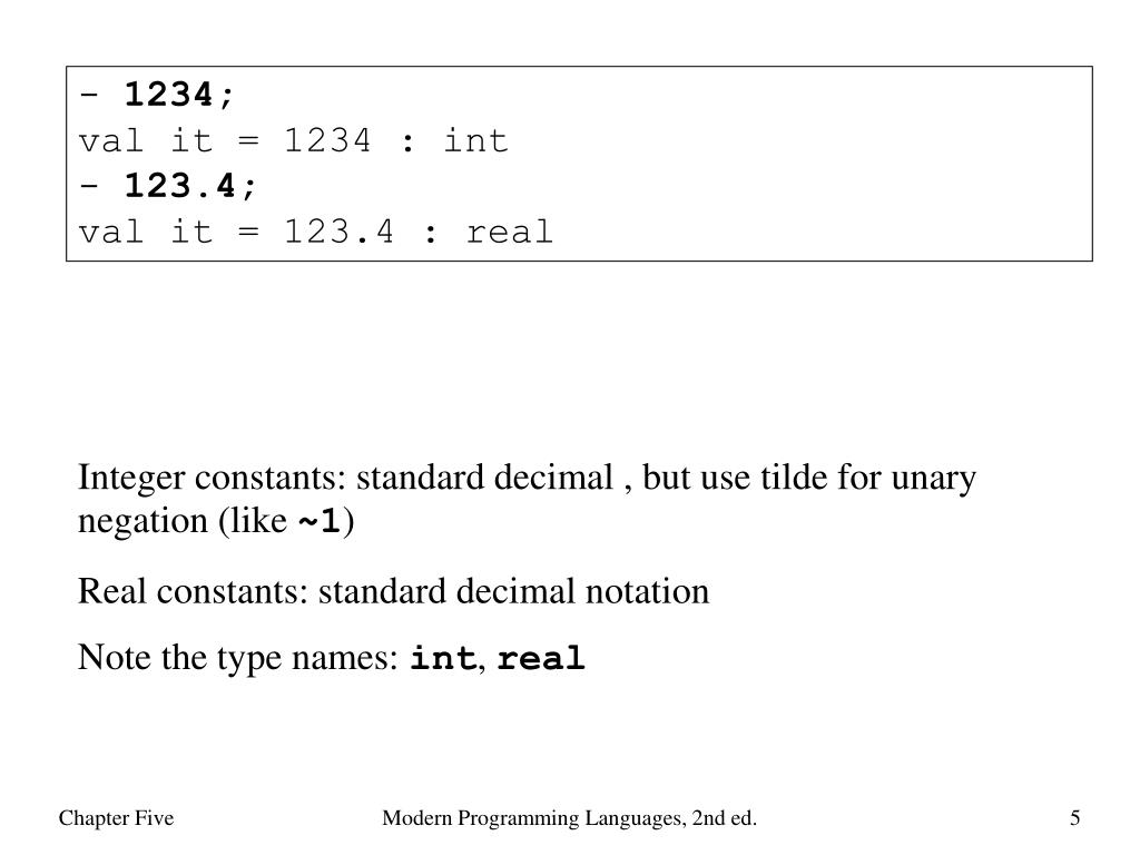 - 1234;val it = 1234 : int- 123.4;val it = 123.4 : real Integer constants: standard decimal , but use tilde for unary negation (like ~1) Real constants: standard decimal notation Note the type names: int, real Modern Programming Languages, 2nd ed.
