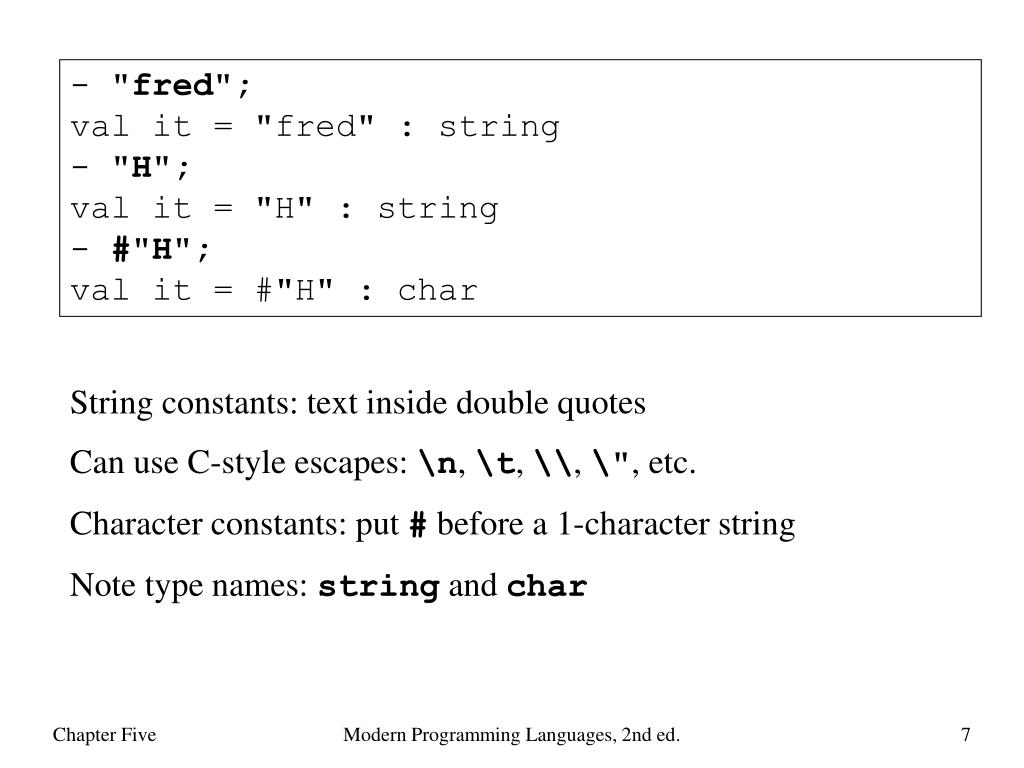 - "fred";val it = "fred" : string- "H";val it = "H" : string- #"H";val it = #"H" : char String constants: text inside double quotes Can use C-style escapes: \n, \t, \\, \", etc. Character constants: put # before a 1-character string Note type names: string and char Modern Programming Languages, 2nd ed.