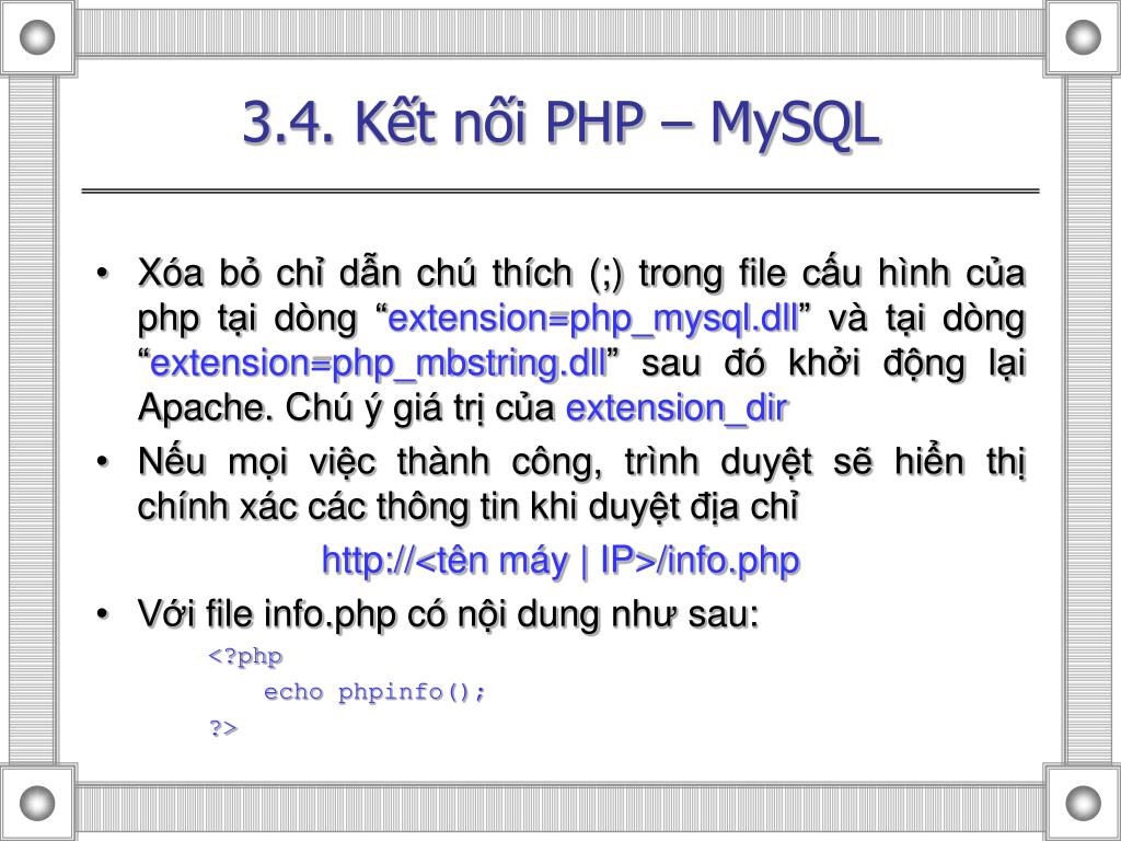 3.4. Kết nối PHP – MySQL • Xóa bỏ chỉ dẫn chú thích (;) trong file cấu hình của php tại dòng “extension=php_mysql.dll” và tại dòng “extension=php_mbstring.dll” sau đó khởi động lại Apache. Chú ý giá trị của extension_dir • Nếu mọi việc thành công, trình duyệt sẽ hiển thị chính xác các thông tin khi duyệt địa chỉ http://<tên máy | IP>/info.php • Với file info.php có nội dung như sau: <?php echo phpinfo(); ?>