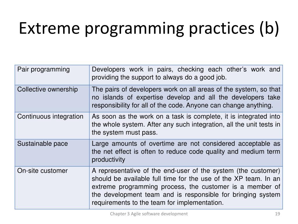 Pair programming • In XP, programmers work in pairs, sitting together to develop code. • This helps develop common ownership of code and spreads knowledge across the team. • It serves as an informal review process as each line of code is looked at by more than 1 person. • It encourages refactoring as the whole team can benefit from this. • Measurements suggest that development productivity with pair programming is similar to that of two people working independently. Chapter 3 Agile software development