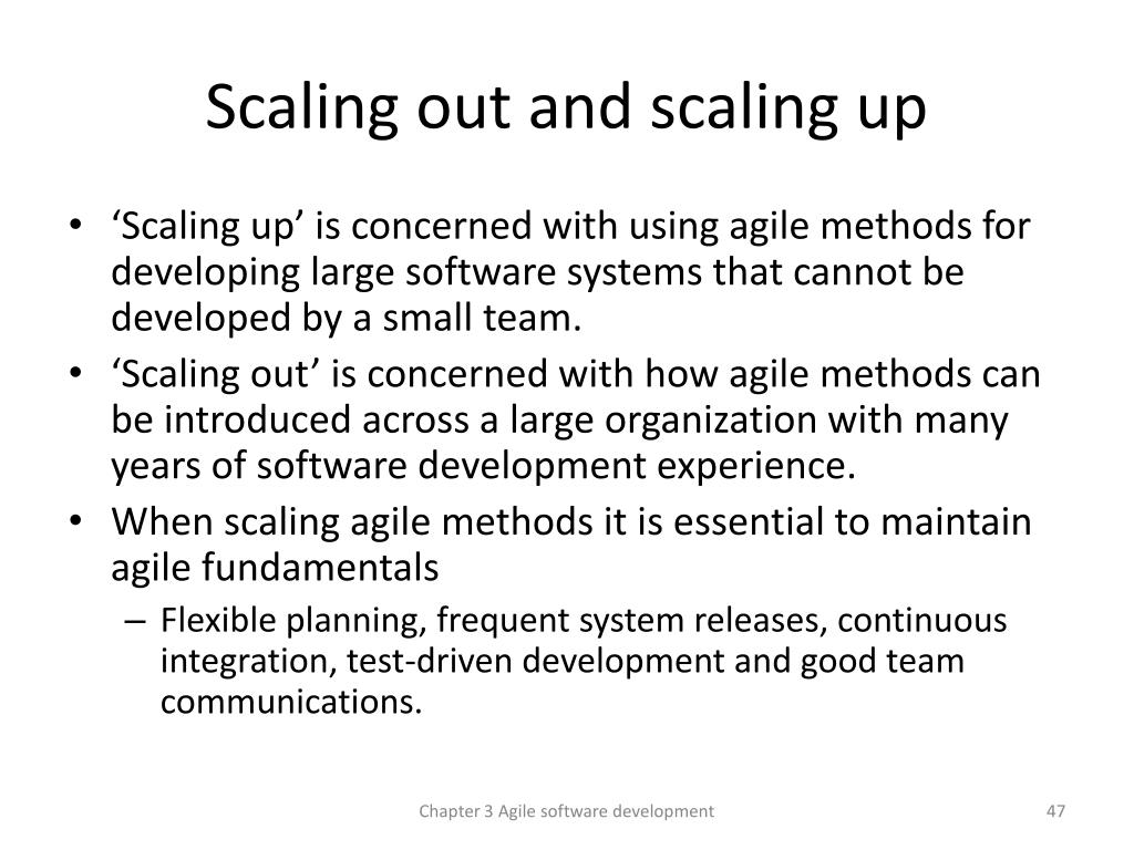 Scaling out and scaling up • ‘Scaling up’ is concerned with using agile methods for developing large software systems that cannot be developed by a small team. • ‘Scaling out’ is concerned with how agile methods can be introduced across a large organization with many years of software development experience. • When scaling agile methods it is essential to maintain agile fundamentals • Flexible planning, frequent system releases, continuous integration, test-driven development and good team communications. Chapter 3 Agile software development