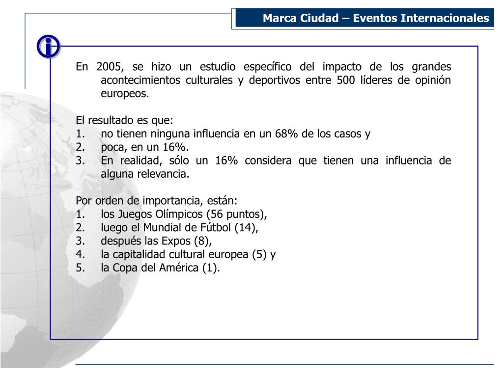En 2005, se hizo un estudio específico del impacto de los grandes acontecimientos culturales y deportivos entre 500 líderes de opinión europeos. El resultado es que: • no tienen ninguna influencia en un 68% de los casos y • poca, en un 16%. • En realidad, sólo un 16% considera que tienen una influencia de alguna relevancia. Por orden de importancia, están: • los Juegos Olímpicos (56 puntos), • luego el Mundial de Fútbol (14), • después las Expos (8), • la capitalidad cultural europea (5) y • la Copa del América (1).