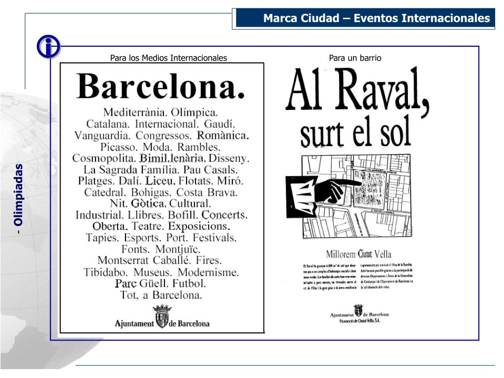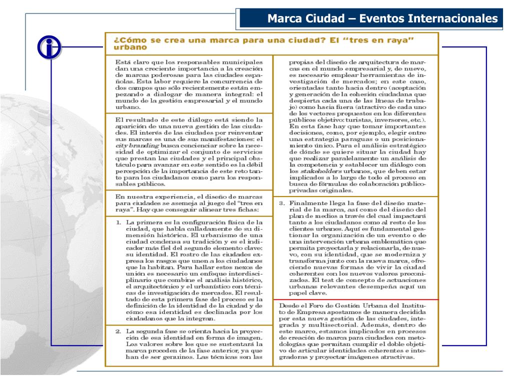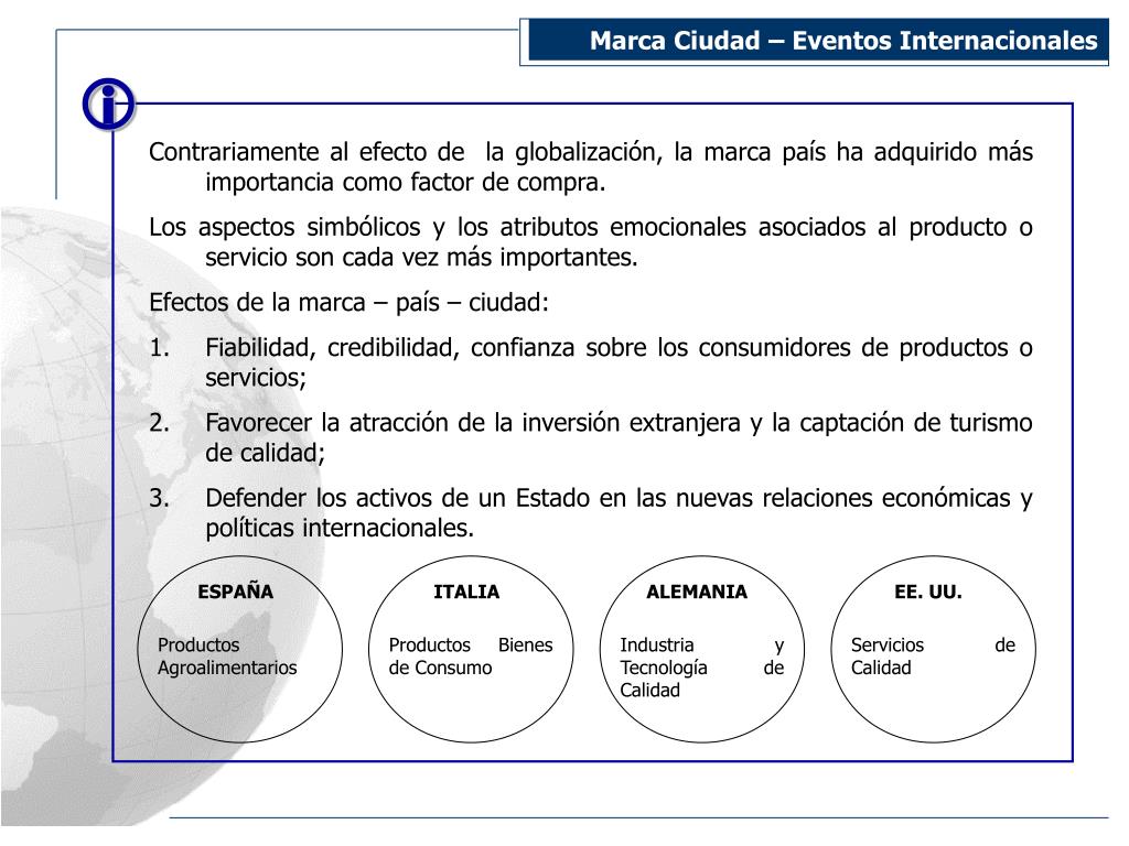 Eventos Internacionales – Marca Ciudad. . Contrariamente al efecto de la globalización, la marca país ha adquirido más importancia como factor de compra. Los aspectos simbólicos y los atributos emocionales asociados al producto o servicio son cada vez más importantes.