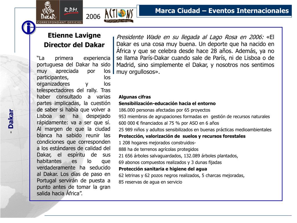 2006 Etienne Lavigne Director del Dakar Presidente Wade en su llegada al Lago Rosa en 2006: «El Dakar es una cosa muy buena. Un deporte que ha nacido en África y que se celebra desde hace 28 años. Además, ya no se llama París-Dakar cuando sale de París, ni de Lisboa o de Madrid, sino simplemente el Dakar, y nosotros nos sentimos muy orgullosos». “La primera experiencia portuguesa del Dakar ha sido muy apreciada por los participantes, los organizadores y los telespectadores del rally. Tras haber consultado a varias partes implicadas, la cuestión de saber si había que volver a Lisboa se ha despejado rápidamente: va a ser que sí. Al margen de que la ciudad blanca ha sabido reunir las condiciones que corresponden a los estándares de calidad del Dakar, el espíritu de sus habitantes es lo que verdaderamente ha seducido al Dakar. Los días de paso en Portugal servirán de puesta a punto antes de tomar la gran salida hacia África”. Dakar Algunas cifras Sensibilización-educación hacia el entorno 186.000 personas afectadas por 65 proyectos 953 miembros de agrupaciones formadas en gestión de recursos naturales 600 000 € financiados al 75 % por ASO en 6 años 25 989 niños y adultos sensibilizados en buenas prácticas medioambientales Protección, valorización de suelos y recursos forestales 1 208 hogares mejorados construidos- 888 ha de terrenos agrícolas protegidos 21 656 árboles salvaguardados, 132.089 árboles plantados, 69 abonos compuestos realizados y 3 dunas fijadas Protección sanitaria e higiene del agua 62 letrinas y 62 pozos negros realizados, 5 charcas mejoradas, 85 reservas de agua en servicio