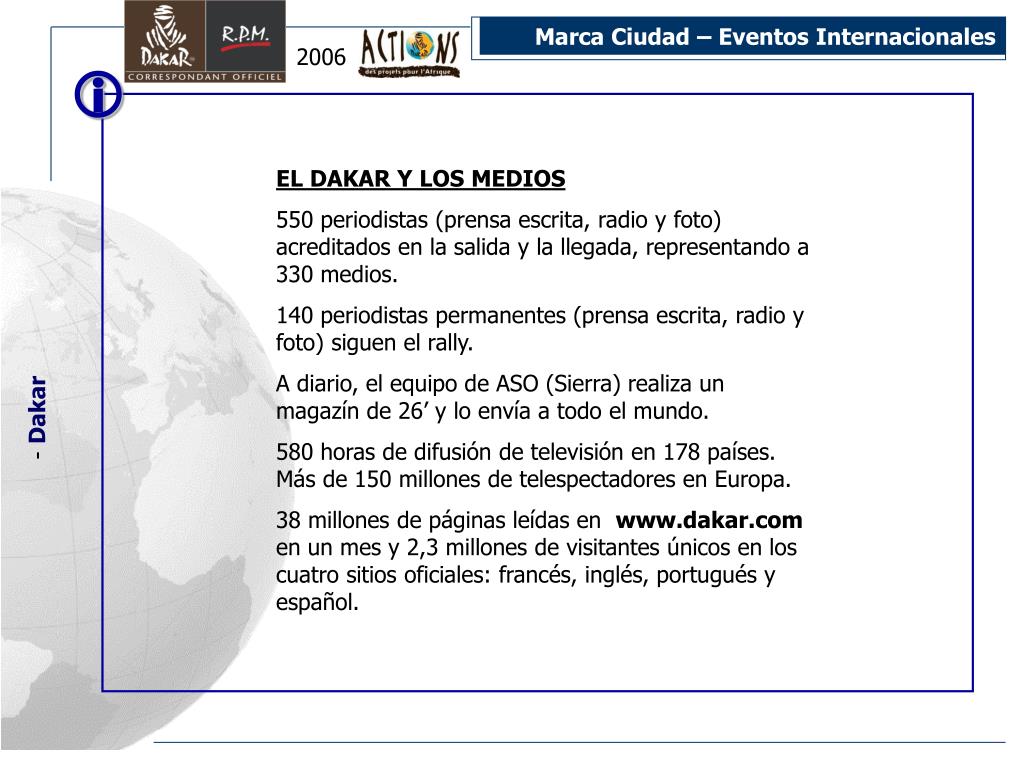 2006 EL DAKAR Y LOS MEDIOS 550 periodistas (prensa escrita, radio y foto) acreditados en la salida y la llegada, representando a 330 medios. 140 periodistas permanentes (prensa escrita, radio y foto) siguen el rally. A diario, el equipo de ASO (Sierra) realiza un magazín de 26’ y lo envía a todo el mundo. 580 horas de difusión de televisión en 178 países. Más de 150 millones de telespectadores en Europa. 38 millones de páginas leídas en www.dakar.com en un mes y 2,3 millones de visitantes únicos en los cuatro sitios oficiales: francés, inglés, portugués y español. Dakar