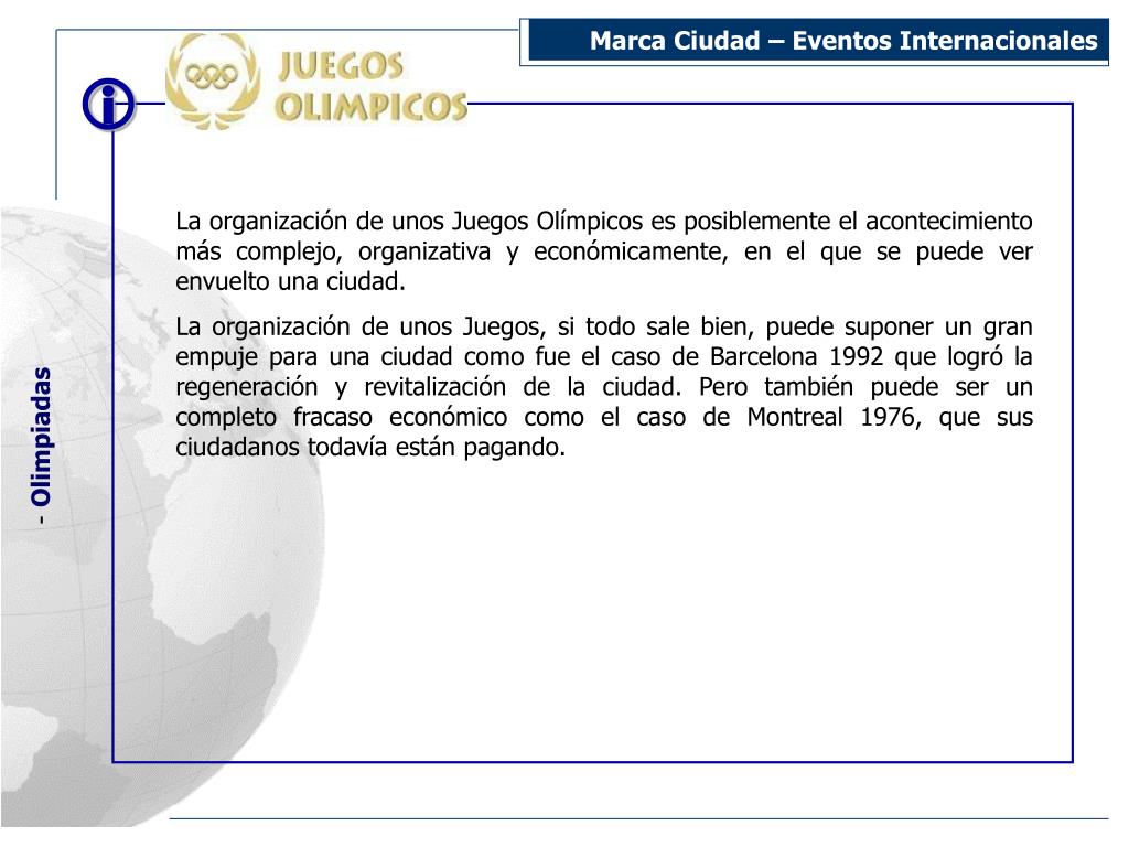 La organización de unos Juegos Olímpicos es posiblemente el acontecimiento más complejo, organizativa y económicamente, en el que se puede ver envuelto una ciudad. La organización de unos Juegos, si todo sale bien, puede suponer un gran empuje para una ciudad como fue el caso de Barcelona 1992 que logró la regeneración y revitalización de la ciudad. Pero también puede ser un completo fracaso económico como el caso de Montreal 1976, que sus ciudadanos todavía están pagando. Olimpiadas