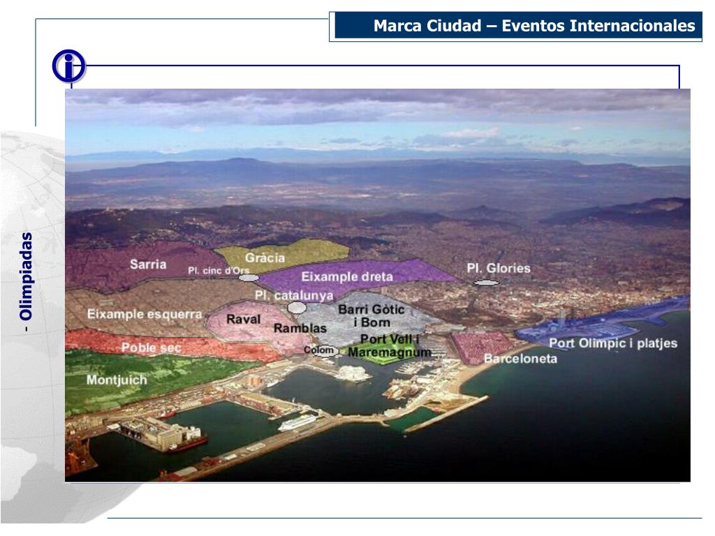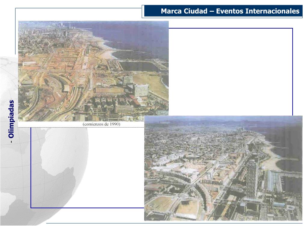 JUEGOS OLÍMPICOS DE BARCELONA El objetivo primordial de los Juegos fue: • Revitalizar el puerto y conectarlo con el resto de la ciudad, • Incrementar el número de viviendas y mejorar el transporte y los servicios, • Promover su imagen en el exterior y atraer la inversión extranjera, • Dotarse de las infraestructuras inmobiliarias que podían ayudarla a convertirse en una de las ciudades más atractivas para los negocios en la nueva Europa que se estaba configurando. De 1,7 MTuristas 1990 – 1,8 MTuristas 1992 – A 6,5MTuristas Est 2007 Olimpiadas
