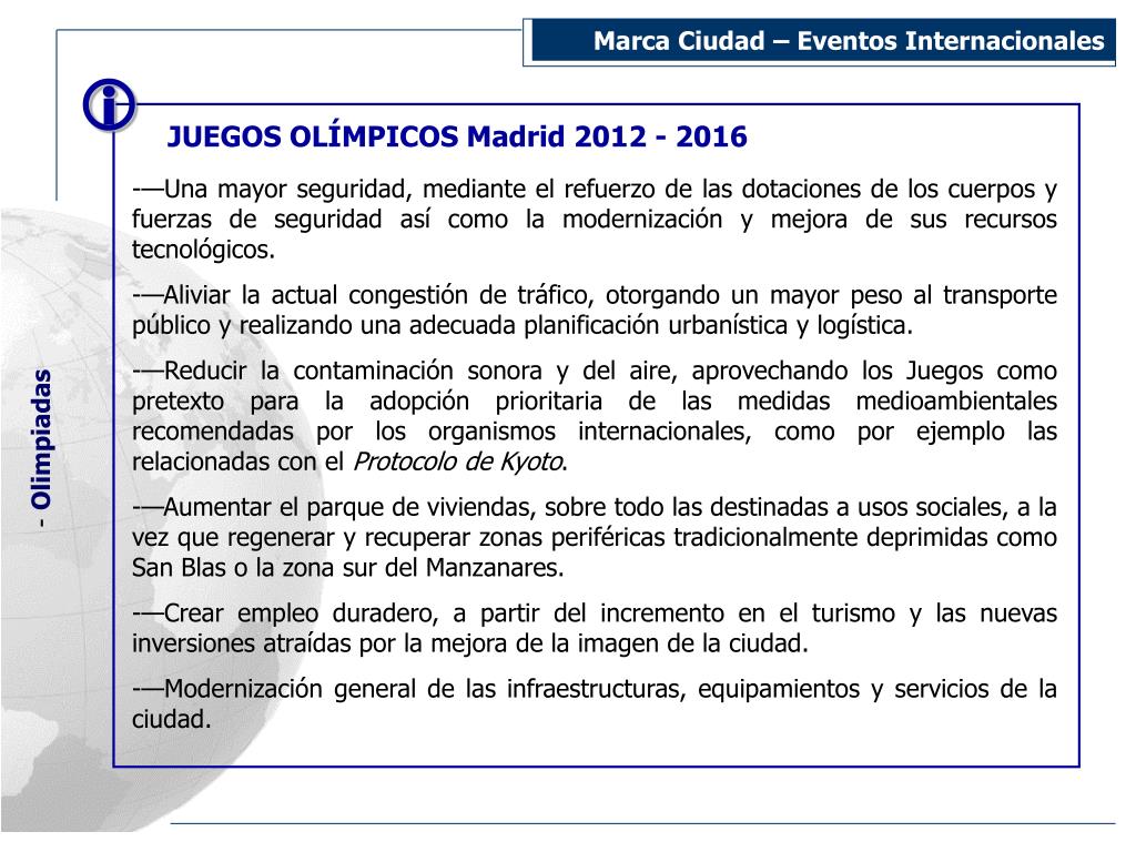 JUEGOS OLÍMPICOS Madrid 2012 - 2016 —Una mayor seguridad, mediante el refuerzo de las dotaciones de los cuerpos y fuerzas de seguridad así como la modernización y mejora de sus recursos tecnológicos. —Aliviar la actual congestión de tráfico, otorgando un mayor peso al transporte público y realizando una adecuada planificación urbanística y logística. —Reducir la contaminación sonora y del aire, aprovechando los Juegos como pretexto para la adopción prioritaria de las medidas medioambientales recomendadas por los organismos internacionales, como por ejemplo las relacionadas con el Protocolo de Kyoto. —Aumentar el parque de viviendas, sobre todo las destinadas a usos sociales, a la vez que regenerar y recuperar zonas periféricas tradicionalmente deprimidas como San Blas o la zona sur del Manzanares. —Crear empleo duradero, a partir del incremento en el turismo y las nuevas inversiones atraídas por la mejora de la imagen de la ciudad. —Modernización general de las infraestructuras, equipamientos y servicios de la ciudad. Olimpiadas