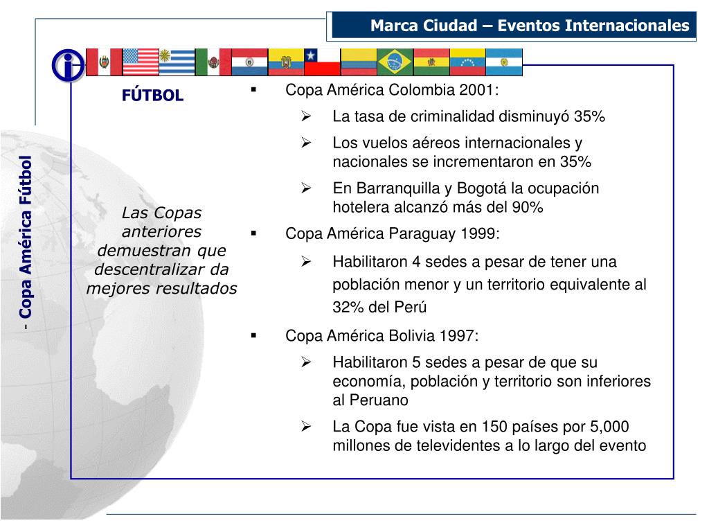 • Copa América Colombia 2001: • La tasa de criminalidad disminuyó 35% • Los vuelos aéreos internacionales y nacionales se incrementaron en 35% • En Barranquilla y Bogotá la ocupación hotelera alcanzó más del 90% • Copa América Paraguay 1999: • Habilitaron 4 sedes a pesar de tener una población menor y un territorio equivalente al 32% del Perú • Copa América Bolivia 1997: • Habilitaron 5 sedes a pesar de que su economía, población y territorio son inferiores al Peruano • La Copa fue vista en 150 países por 5,000 millones de televidentes a lo largo del evento FÚTBOL Copa América Fútbol Las Copas anteriores demuestran que descentralizar da mejores resultados