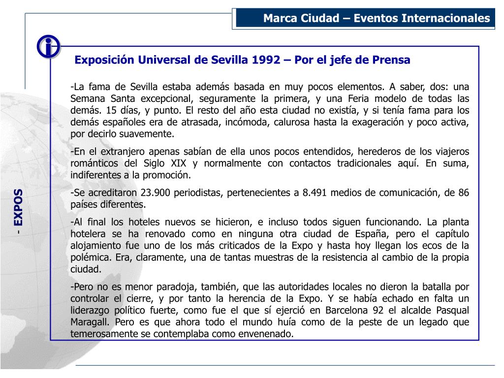 Exposición Universal de Sevilla 1992 – Por el jefe de Prensa La fama de Sevilla estaba además basada en muy pocos elementos. A saber, dos: una Semana Santa excepcional, seguramente la primera, y una Feria modelo de todas las demás. 15 días, y punto. El resto del año esta ciudad no existía, y si tenía fama para los demás españoles era de atrasada, incómoda, calurosa hasta la exageración y poco activa, por decirlo suavemente. En el extranjero apenas sabían de ella unos pocos entendidos, herederos de los viajeros románticos del Siglo XIX y normalmente con contactos tradicionales aquí. En suma, indiferentes a la promoción. Se acreditaron 23.900 periodistas, pertenecientes a 8.491 medios de comunicación, de 86 países diferentes. Al final los hoteles nuevos se hicieron, e incluso todos siguen funcionando. La planta hotelera se ha renovado como en ninguna otra ciudad de España, pero el capítulo alojamiento fue uno de los más criticados de la Expo y hasta hoy llegan los ecos de la polémica. Era, claramente, una de tantas muestras de la resistencia al cambio de la propia ciudad. Pero no es menor paradoja, también, que las autoridades locales no dieron la batalla por controlar el cierre, y por tanto la herencia de la Expo. Y se había echado en falta un liderazgo político fuerte, como fue el que sí ejerció en Barcelona 92 el alcalde Pasqual Maragall. Pero es que ahora todo el mundo huía como de la peste de un legado que temerosamente se contemplaba como envenenado. EXPOS