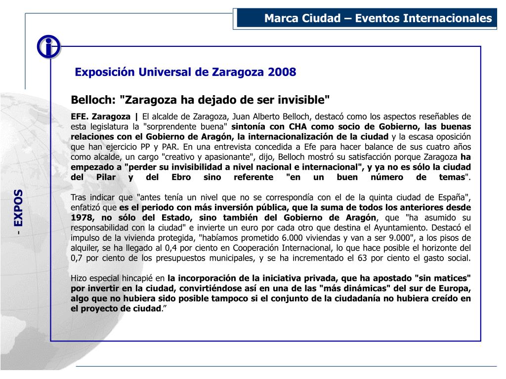 Exposición Universal de Zaragoza 2008 Belloch: "Zaragoza ha dejado de ser invisible" EFE. Zaragoza | El alcalde de Zaragoza, Juan Alberto Belloch, destacó como los aspectos reseñables de esta legislatura la "sorprendente buena" sintonía con CHA como socio de Gobierno, las buenas relaciones con el Gobierno de Aragón, la internacionalización de la ciudad y la escasa oposición que han ejercicio PP y PAR. En una entrevista concedida a Efe para hacer balance de sus cuatro años como alcalde, un cargo "creativo y apasionante", dijo, Belloch mostró su satisfacción porque Zaragoza ha empezado a "perder su invisibilidad a nivel nacional e internacional", y ya no es sólo la ciudad del Pilar y del Ebro sino referente "en un buen número de temas".Tras indicar que "antes tenía un nivel que no se correspondía con el de la quinta ciudad de España", enfatizó que es el periodo con más inversión pública, que la suma de todos los anteriores desde 1978, no sólo del Estado, sino también del Gobierno de Aragón, que "ha asumido su responsabilidad con la ciudad" e invierte un euro por cada otro que destina el Ayuntamiento. Destacó el impulso de la vivienda protegida, "habíamos prometido 6.000 viviendas y van a ser 9.000", a los pisos de alquiler, se ha llegado al 0,4 por ciento en Cooperación Internacional, lo que hace posible el horizonte del 0,7 por ciento de los presupuestos municipales, y se ha incrementado el 63 por ciento el gasto social.Hizo especial hincapié en la incorporación de la iniciativa privada, que ha apostado "sin matices" por invertir en la ciudad, convirtiéndose así en una de las "más dinámicas" del sur de Europa, algo que no hubiera sido posible tampoco si el conjunto de la ciudadanía no hubiera creído en el proyecto de ciudad.” EXPOS