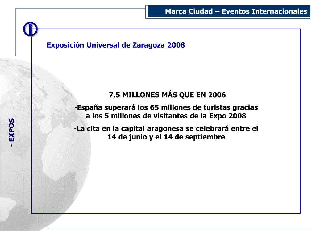 Exposición Universal de Zaragoza 2008 EXPOS • 7,5 MILLONES MÁS QUE EN 2006 • España superará los 65 millones de turistas gracias a los 5 millones de visitantes de la Expo 2008 • La cita en la capital aragonesa se celebrará entre el 14 de junio y el 14 de septiembre