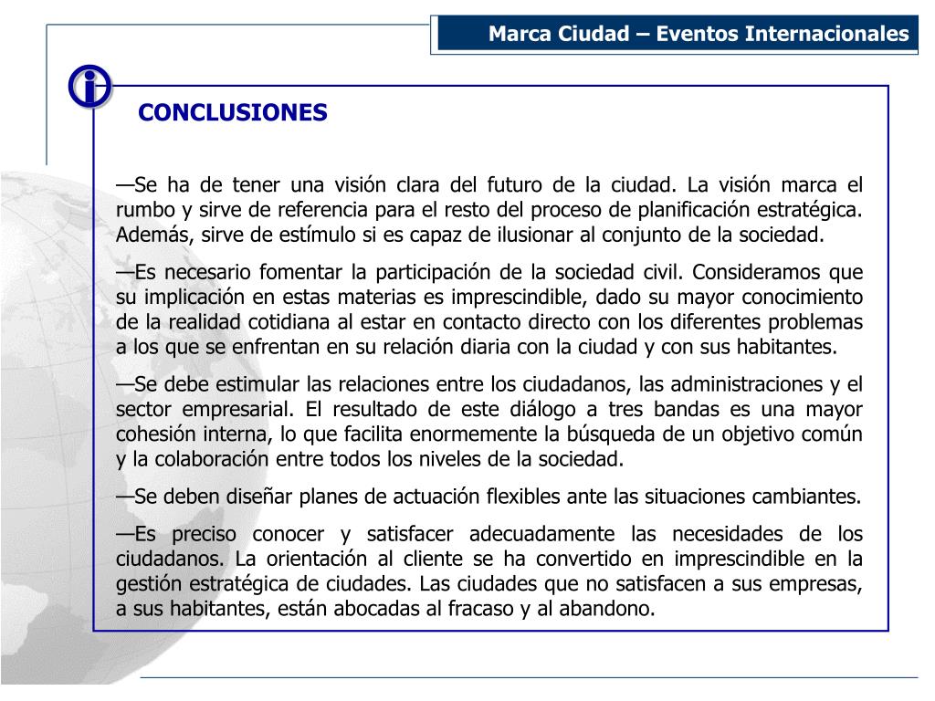 CONCLUSIONES —Se ha de tener una visión clara del futuro de la ciudad. La visión marca el rumbo y sirve de referencia para el resto del proceso de planificación estratégica. Además, sirve de estímulo si es capaz de ilusionar al conjunto de la sociedad. —Es necesario fomentar la participación de la sociedad civil. Consideramos que su implicación en estas materias es imprescindible, dado su mayor conocimiento de la realidad cotidiana al estar en contacto directo con los diferentes problemas a los que se enfrentan en su relación diaria con la ciudad y con sus habitantes. —Se debe estimular las relaciones entre los ciudadanos, las administraciones y el sector empresarial. El resultado de este diálogo a tres bandas es una mayor cohesión interna, lo que facilita enormemente la búsqueda de un objetivo común y la colaboración entre todos los niveles de la sociedad. —Se deben diseñar planes de actuación flexibles ante las situaciones cambiantes. —Es preciso conocer y satisfacer adecuadamente las necesidades de los ciudadanos. La orientación al cliente se ha convertido en imprescindible en la gestión estratégica de ciudades. Las ciudades que no satisfacen a sus empresas, a sus habitantes, están abocadas al fracaso y al abandono.