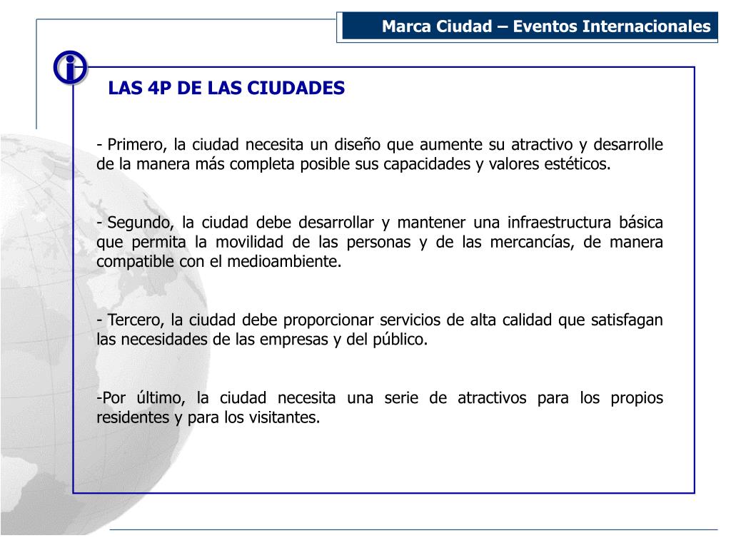 LAS 4P DE LAS CIUDADES Primero, la ciudad necesita un diseño que aumente su atractivo y desarrolle de la manera más completa posible sus capacidades y valores estéticos. Segundo, la ciudad debe desarrollar y mantener una infraestructura básica que permita la movilidad de las personas y de las mercancías, de manera compatible con el medioambiente. Tercero, la ciudad debe proporcionar servicios de alta calidad que satisfagan las necesidades de las empresas y del público. Por último, la ciudad necesita una serie de atractivos para los propios residentes y para los visitantes.