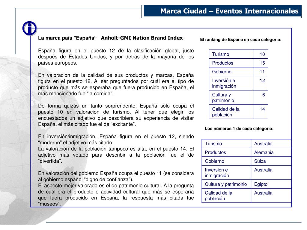 La marca país "España“ Anholt-GMI Nation Brand Index España figura en el puesto 12 de la clasificación global, justo después de Estados Unidos, y por detrás de la mayoría de los países europeos. En valoración de la calidad de sus productos y marcas, España figura en el puesto 12. Al ser preguntados por cuál era el tipo de producto que más se esperaba que fuera producido en España, el más mencionado fue “la comida”. De forma quizás un tanto sorprendente, España sólo ocupa el puesto 10 en valoración de turismo. Al tener que elegir los encuestados un adjetivo que describiera su experiencia de visitar España, el más citado fue el de “excitante”. En inversión/inmigración, España figura en el puesto 12, siendo “moderno” el adjetivo más citado. La valoración de la población tampoco es alta, en el puesto 14. El adjetivo más votado para describir a la población fue el de “divertida”. En valoración del gobierno España ocupa el puesto 11 (se considera al gobierno español “digno de confianza”). El aspecto mejor valorado es el de patrimonio cultural. A la pregunta de cuál era el producto o actividad cultural que más se esperaría que fuera producido en España, la respuesta más citada fue “museos”. El ranking de España en cada categoría: Los números 1 de cada categoría: