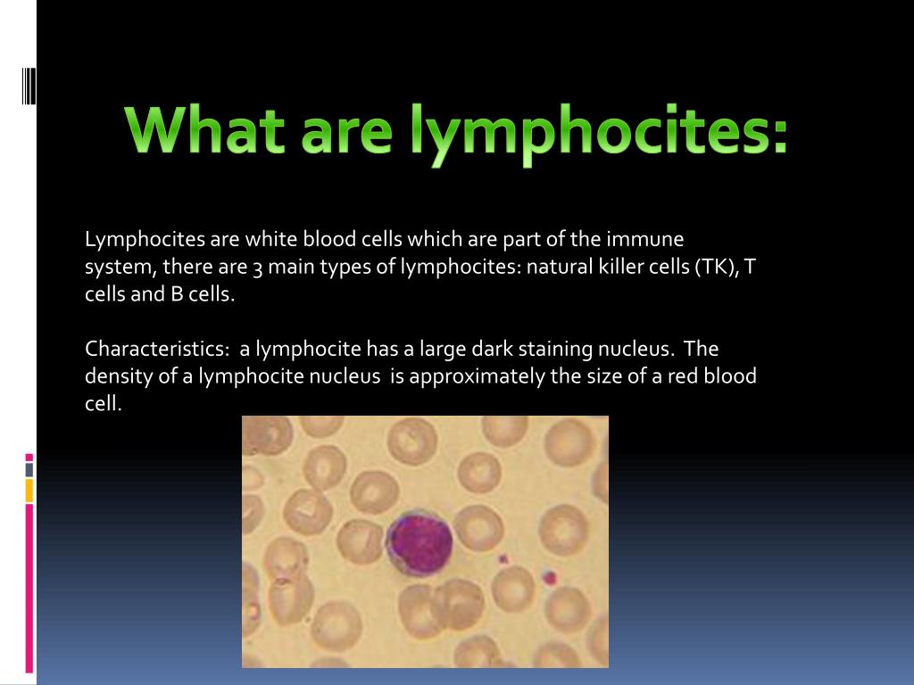 What are lymphocites: Lymphocites are white blood cells which are part of the immune system, there are 3 main types of lymphocites: natural killer cells (TK), T cells and B cells. Characteristics: a lymphocite has a large dark staining nucleus. The density of a lymphocite nucleus is approximately the size of a red blood cell.