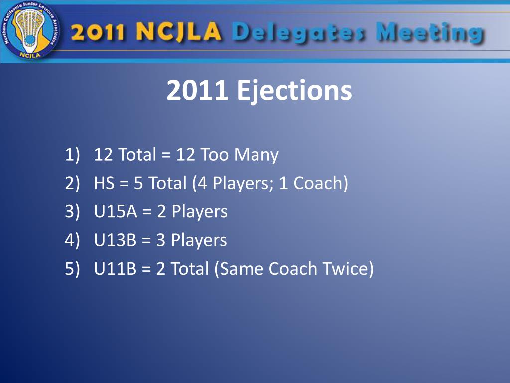2011 Ejections • 12 Total = 12 Too Many • HS = 5 Total (4 Players; 1 Coach) • U15A = 2 Players • U13B = 3 Players • U11B = 2 Total (Same Coach Twice)