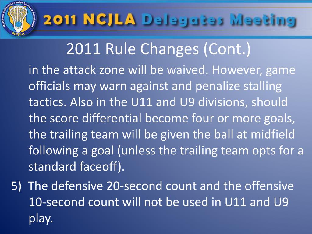 2011 Rule Changes (Cont.) in the attack zone will be waived. However, game officials may warn against and penalize stalling tactics. Also in the U11 and U9 divisions, should the score differential become four or more goals, the trailing team will be given the ball at midfield following a goal (unless the trailing team opts for a standard faceoff). 5) The defensive 20-second count and the offensive 10-second count will not be used in U11 and U9 play.