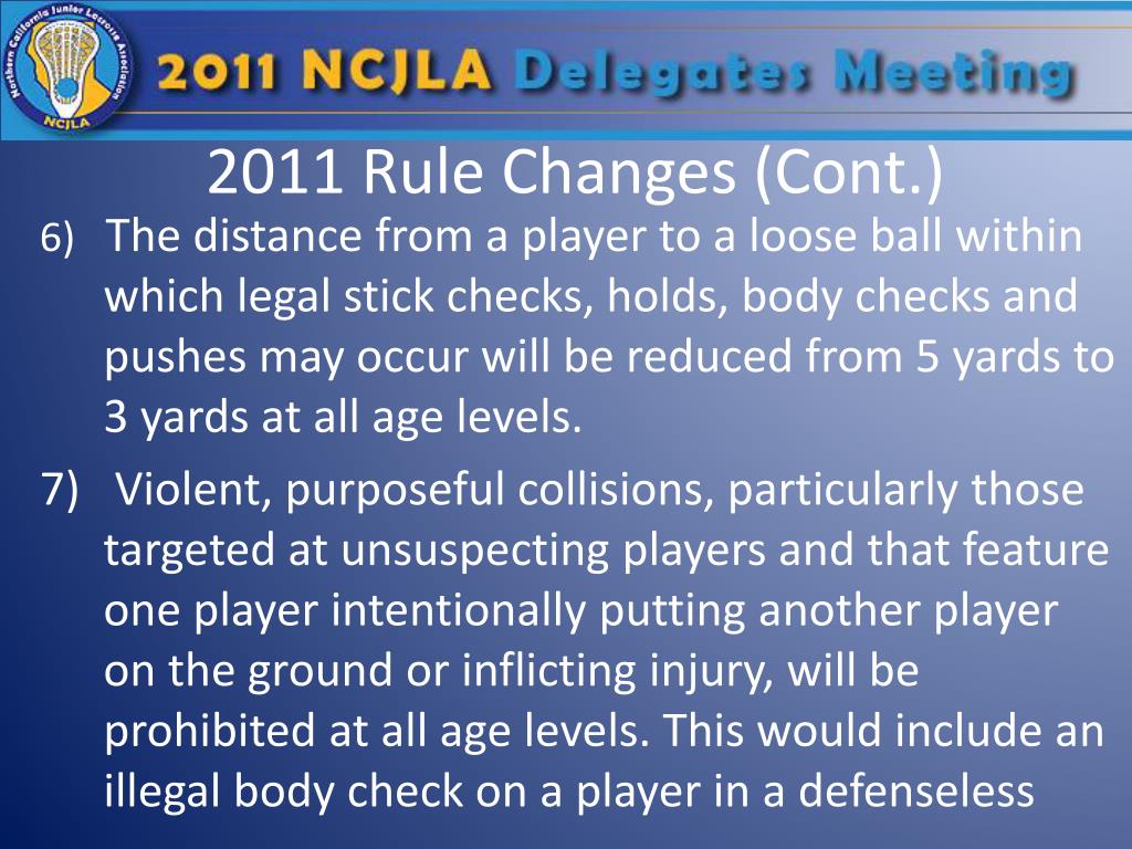 2011 Rule Changes (Cont.) 6) The distance from a player to a loose ball within which legal stick checks, holds, body checks and pushes may occur will be reduced from 5 yards to 3 yards at all age levels. 7) Violent, purposeful collisions, particularly those targeted at unsuspecting players and that feature one player intentionally putting another player on the ground or inflicting injury, will be prohibited at all age levels. This would include an illegal body check on a player in a defenseless