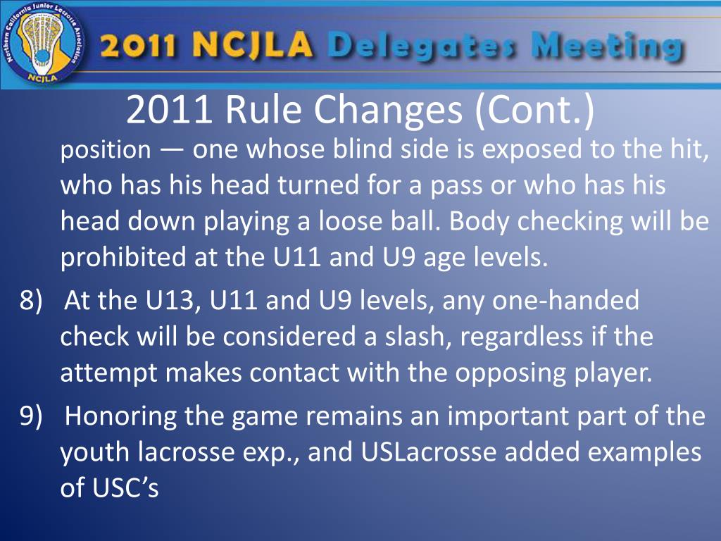 2011 Rule Changes (Cont.) position — one whose blind side is exposed to the hit, who has his head turned for a pass or who has his head down playing a loose ball. Body checking will be prohibited at the U11 and U9 age levels. 8) At the U13, U11 and U9 levels, any one-handed check will be considered a slash, regardless if the attempt makes contact with the opposing player. 9) Honoring the game remains an important part of the youth lacrosse exp., and USLacrosse added examples of USC’s