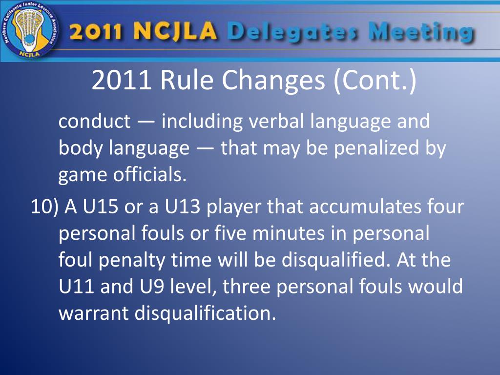 2011 Rule Changes (Cont.) conduct — including verbal language and body language — that may be penalized by game officials. 10) A U15 or a U13 player that accumulates four personal fouls or five minutes in personal foul penalty time will be disqualified. At the U11 and U9 level, three personal fouls would warrant disqualification.