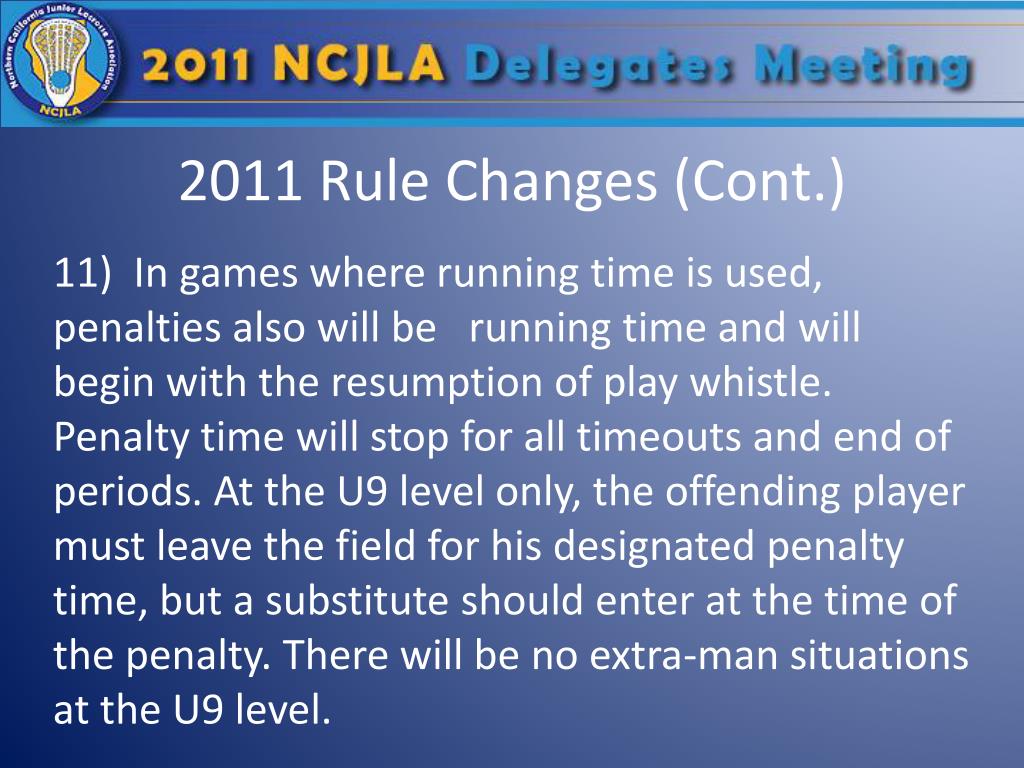 2011 Rule Changes (Cont.) 11) In games where running time is used, penalties also will be running time and will begin with the resumption of play whistle. Penalty time will stop for all timeouts and end of periods. At the U9 level only, the offending player must leave the field for his designated penalty time, but a substitute should enter at the time of the penalty. There will be no extra-man situations at the U9 level.
