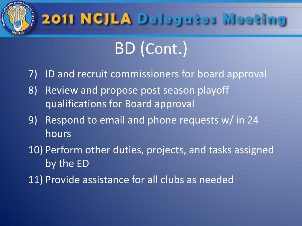 BD (Cont.) 7) ID and recruit commissioners for board approval Review and propose post season playoff qualifications for Board approval Respond to email and phone requests w/ in 24 hours Perform other duties, projects, and tasks assigned by the ED Provide assistance for all clubs as needed