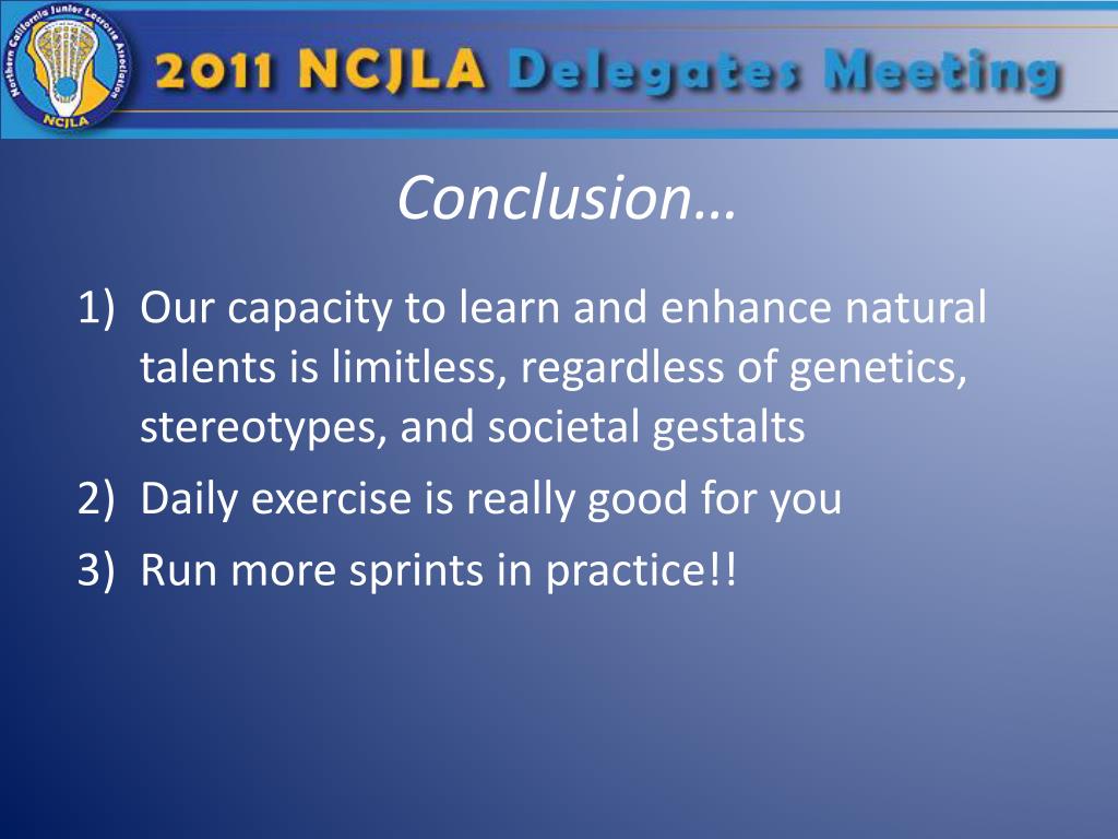 Conclusion… • Our capacity to learn and enhance natural talents is limitless, regardless of genetics, stereotypes, and societal gestalts • Daily exercise is really good for you • Run more sprints in practice!!