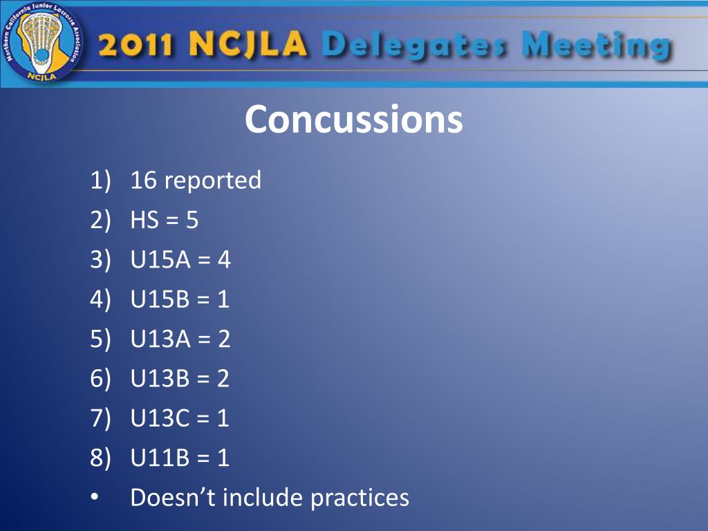 Concussions • 16 reported • HS = 5 • U15A = 4 • U15B = 1 • U13A = 2 • U13B = 2 • U13C = 1 • U11B = 1 • Doesn’t include practices