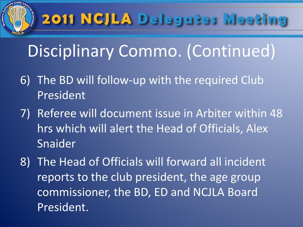 Disciplinary Commo. (Continued) • The BD will follow-up with the required Club President • Referee will document issue in Arbiter within 48 hrs which will alert the Head of Officials, Alex Snaider • The Head of Officials will forward all incident reports to the club president, the age group commissioner, the BD, ED and NCJLA Board President.