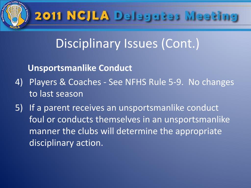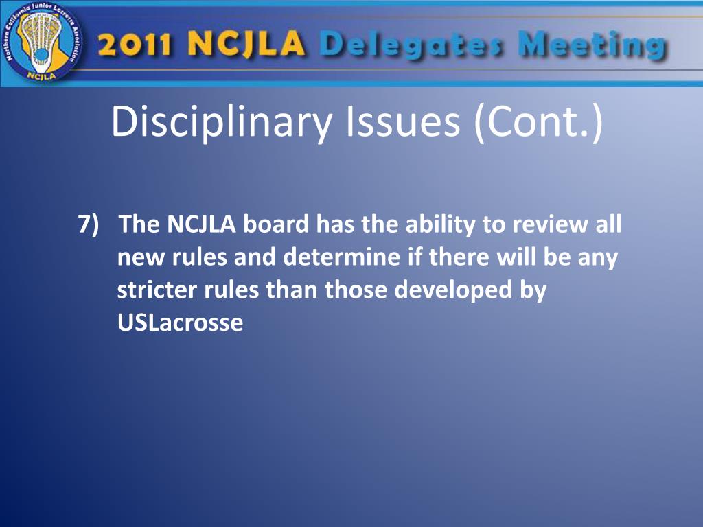 Disciplinary Issues (Cont.) 7) The NCJLA board has the ability to review all new rules and determine if there will be any stricter rules than those developed by USLacrosse