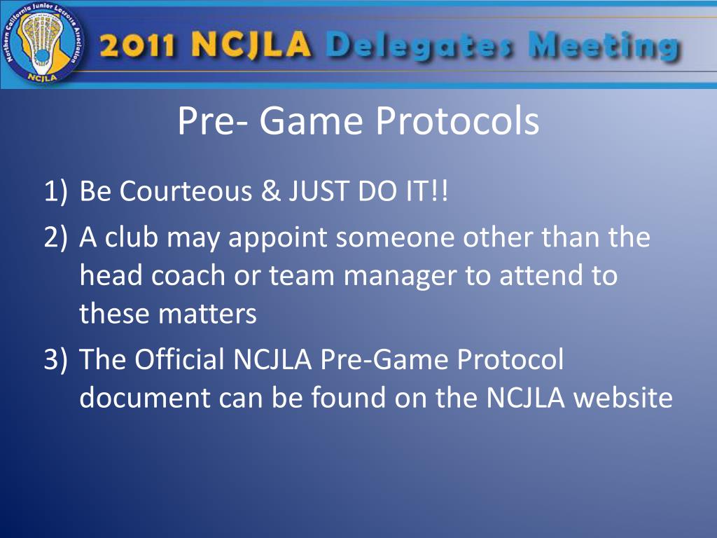 Pre- Game Protocols • Be Courteous & JUST DO IT!! • A club may appoint someone other than the head coach or team manager to attend to these matters • The Official NCJLA Pre-Game Protocol document can be found on the NCJLA website