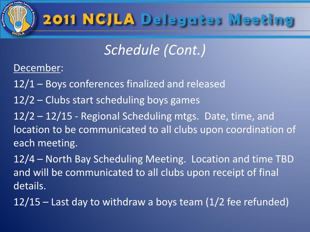 Schedule (Cont.) December: 12/1 – Boys conferences finalized and released 12/2 – Clubs start scheduling boys games 12/2 – 12/15 - Regional Scheduling mtgs. Date, time, and location to be communicated to all clubs upon coordination of each meeting. 12/4 – North Bay Scheduling Meeting. Location and time TBD and will be communicated to all clubs upon receipt of final details. 12/15 – Last day to withdraw a boys team (1/2 fee refunded)