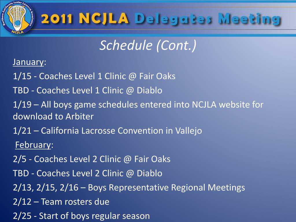 Schedule (Cont.) January: 1/15 - Coaches Level 1 Clinic @ Fair Oaks TBD - Coaches Level 1 Clinic @ Diablo 1/19 – All boys game schedules entered into NCJLA website for download to Arbiter 1/21 – California Lacrosse Convention in Vallejo February: 2/5 - Coaches Level 2 Clinic @ Fair Oaks TBD - Coaches Level 2 Clinic @ Diablo 2/13, 2/15, 2/16 – Boys Representative Regional Meetings 2/12 – Team rosters due 2/25 - Start of boys regular season
