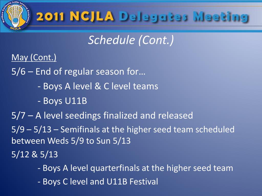 Schedule (Cont.) May (Cont.) 5/6 – End of regular season for… - Boys A level & C level teams - Boys U11B 5/7 – A level seedings finalized and released 5/9 – 5/13 – Semifinals at the higher seed team scheduled between Weds 5/9 to Sun 5/13 5/12 & 5/13 - Boys A level quarterfinals at the higher seed team - Boys C level and U11B Festival