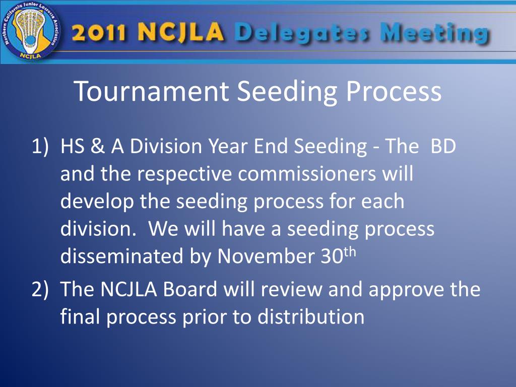 Tournament Seeding Process • HS & A Division Year End Seeding - The BD and the respective commissioners will develop the seeding process for each division. We will have a seeding process disseminated by November 30th • The NCJLA Board will review and approve the final process prior to distribution