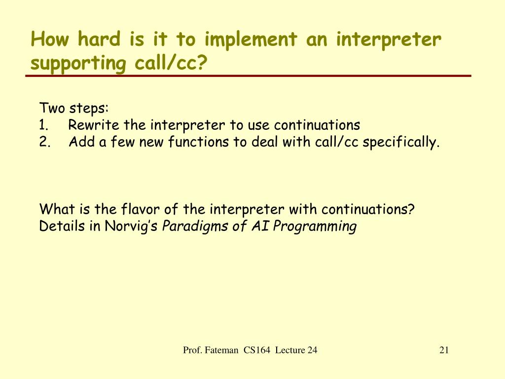 How hard is it to implement an interpreter supporting call/cc? Two steps: • Rewrite the interpreter to use continuations • Add a few new functions to deal with call/cc specifically. What is the flavor of the interpreter with continuations? Details in Norvig’s Paradigms of AI Programming Prof. Fateman CS164 Lecture 24