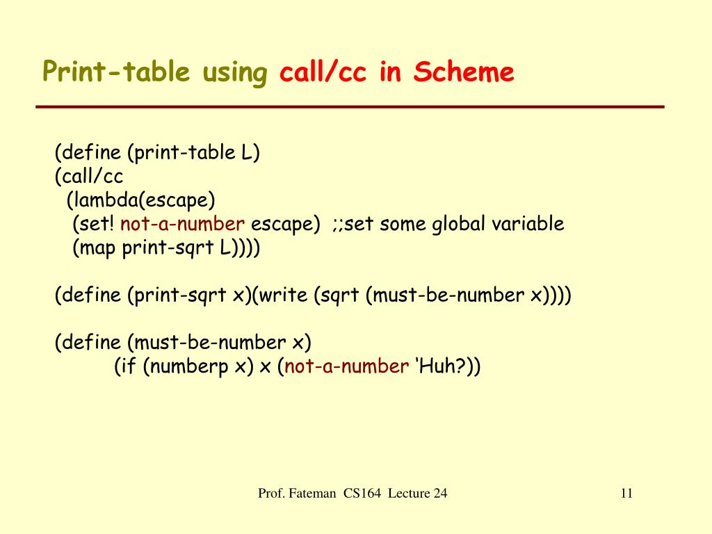 Print-table using call/cc in Scheme (define (print-table L) (call/cc (lambda(escape) (set! not-a-number escape) ;;set some global variable (map print-sqrt L)))) (define (print-sqrt x)(write (sqrt (must-be-number x)))) (define (must-be-number x) (if (numberp x) x (not-a-number ‘Huh?)) Prof. Fateman CS164 Lecture 24