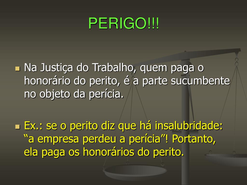 PERIGO!!! Na Justiça do Trabalho, quem paga o honorário do perito, é a parte sucumbente no objeto da perícia. Ex.: se o perito diz que há insalubridade: “a empresa perdeu a perícia”! Portanto, ela paga os honorários do perito.