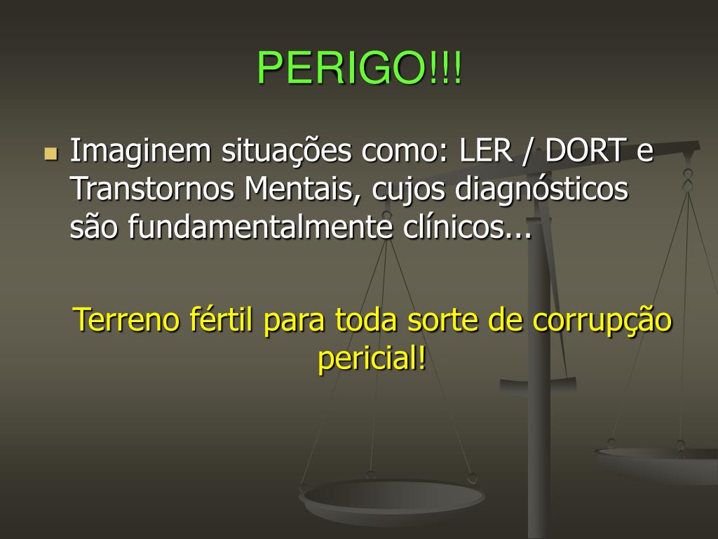 PERIGO!!! Imaginem situações como: LER / DORT e Transtornos Mentais, cujos diagnósticos são fundamentalmente clínicos... Terreno fértil para toda sorte de corrupção pericial!