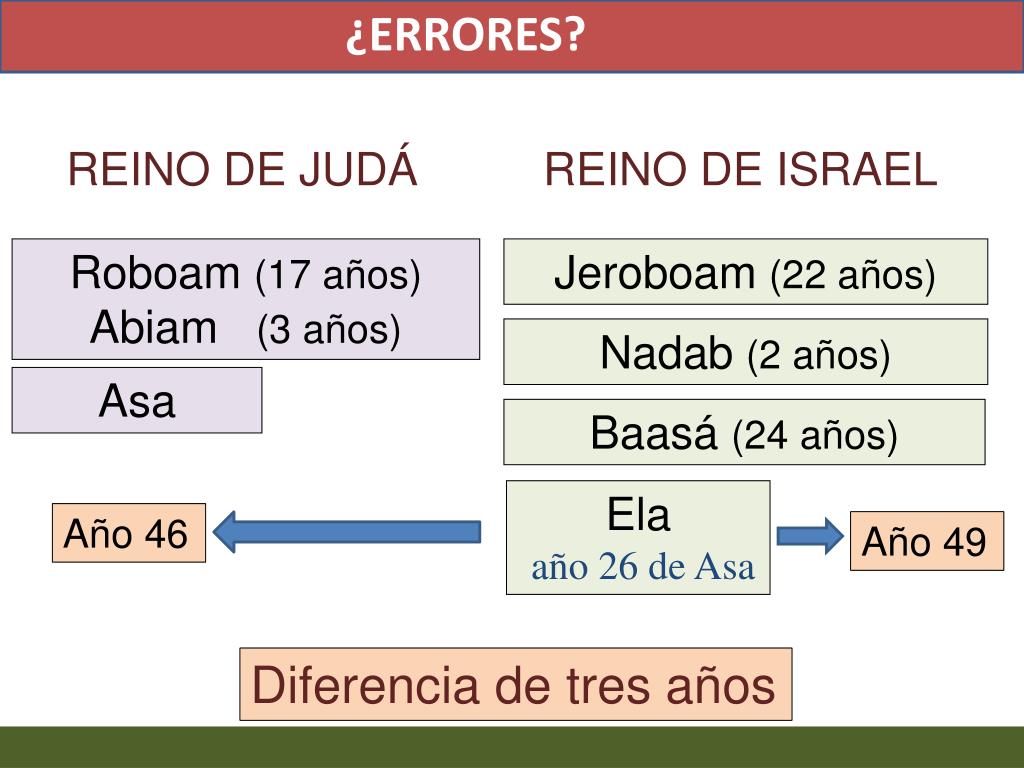 ¿ERRORES? REINO DE JUDÁ REINO DE ISRAEL Roboam(17 años) Abiam(3 años) Jeroboam(22 años) Nadab(2 años) Asa Baasá(24 años) Ela año 26 de Asa Año 46 Año 49 Diferencia de tres años