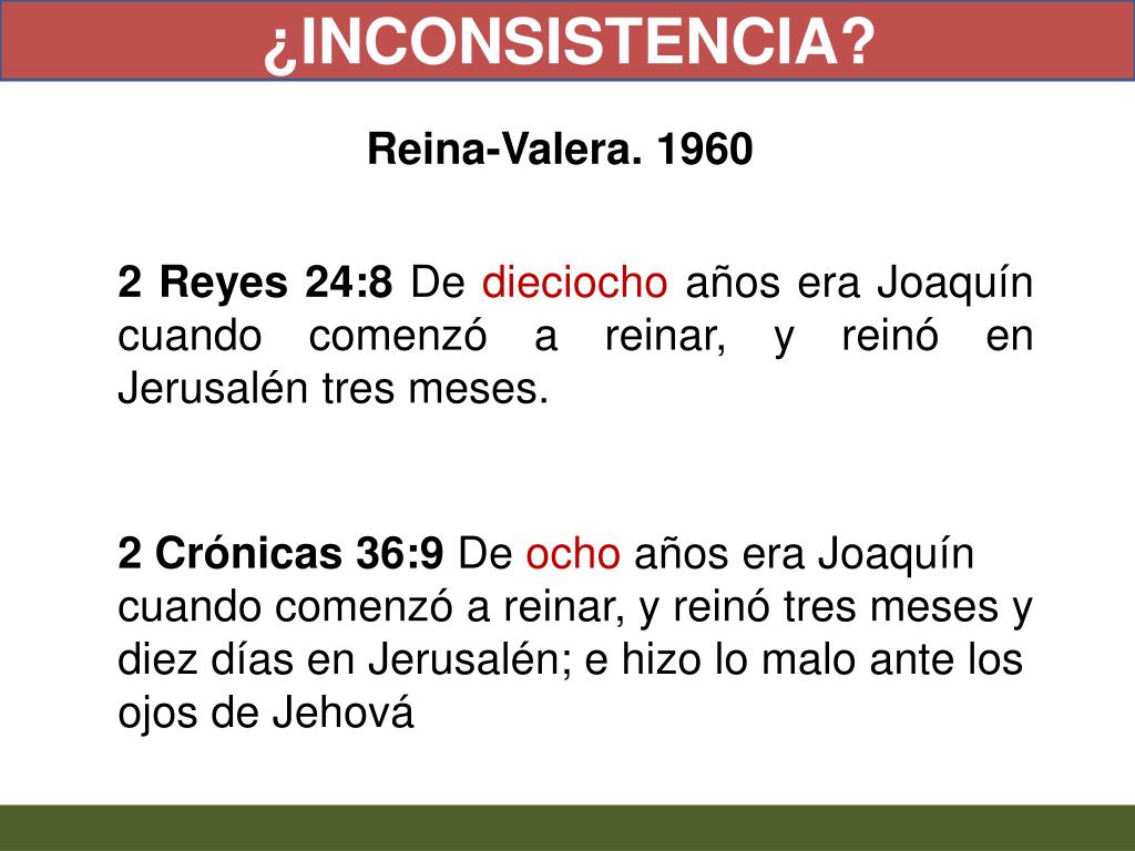 ¿INCONSISTENCIA? Reina-Valera. 1960 2 Reyes 24:8 De dieciocho años era Joaquín cuando comenzó a reinar, y reinó en Jerusalén tres meses. 2 Crónicas 36:9 De ocho años era Joaquín cuando comenzó a reinar, y reinó tres meses y diez días en Jerusalén; e hizo lo malo ante los ojos de Jehová