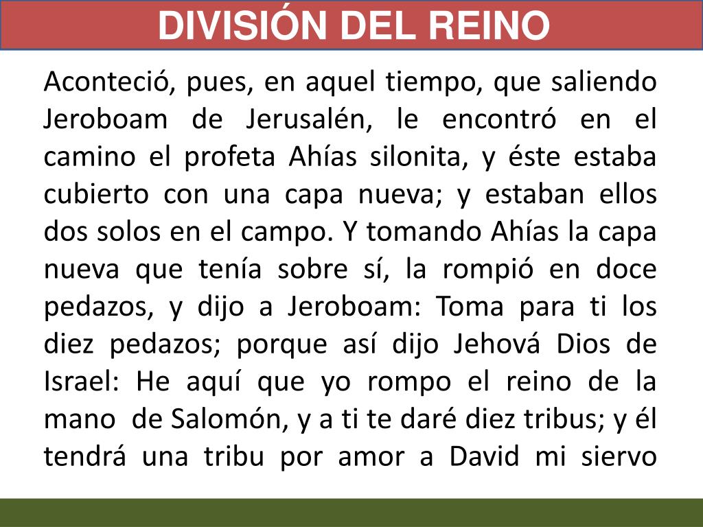 DIVISIÓN DEL REINO Aconteció, pues, en aquel tiempo, que saliendoJeroboam de Jerusalén, le encontró en el camino el profeta Ahíassilonita, y éste estaba cubierto con una capa nueva; y estaban ellos dos solos en el campo. Y tomando Ahías la capa nueva que tenía sobre sí, la rompió en doce pedazos, y dijo a Jeroboam: Toma para ti los diez pedazos; porque así dijo Jehová Dios de Israel: He aquí que yo rompo el reino de la mano de Salomón, y a ti te daré diez tribus; y él tendrá una tribu por amor a David mi siervo
